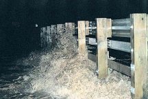 waters slam against the Kinkade Island bridge after